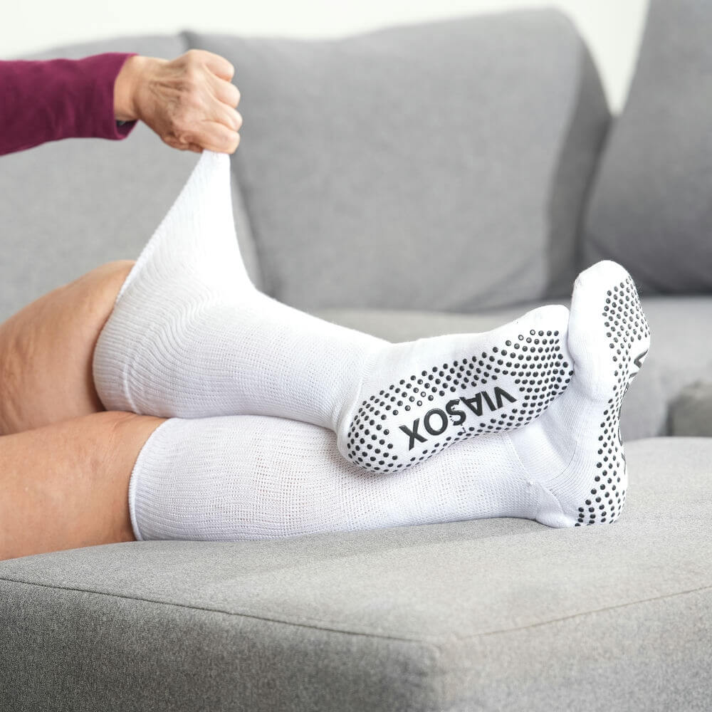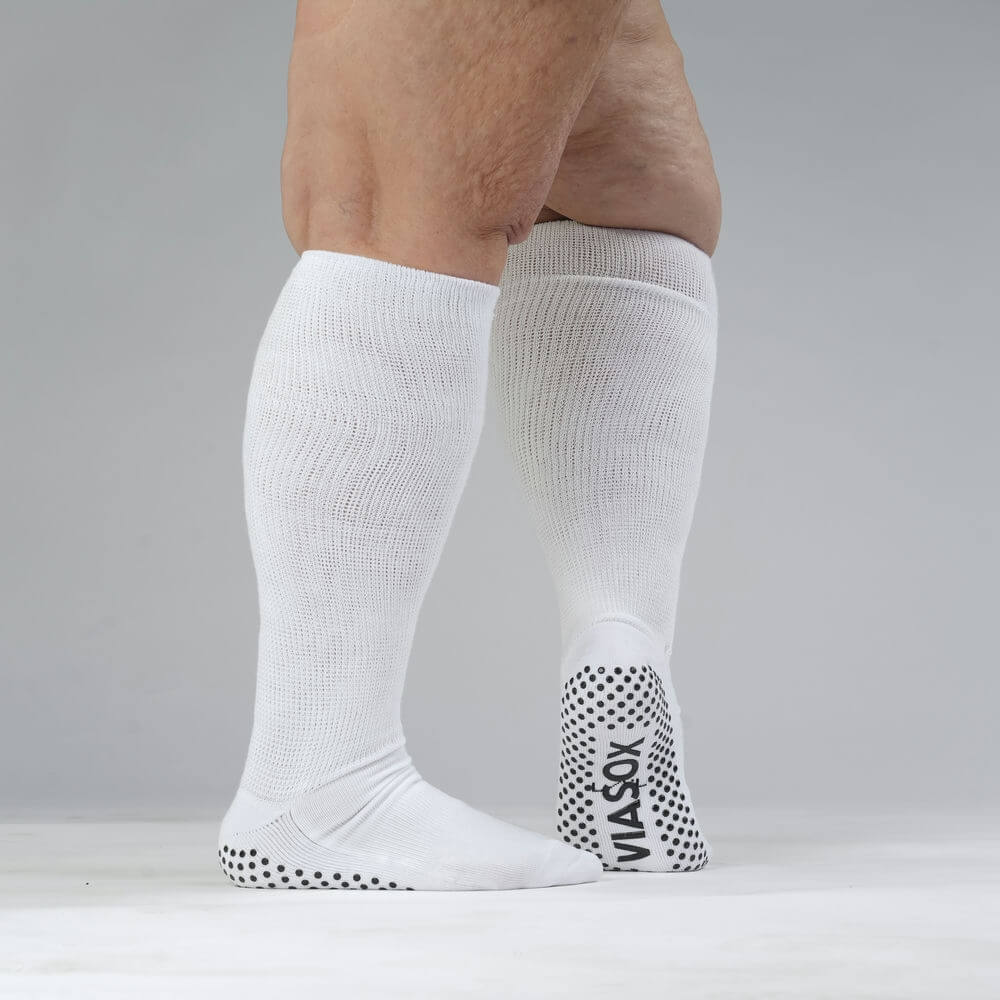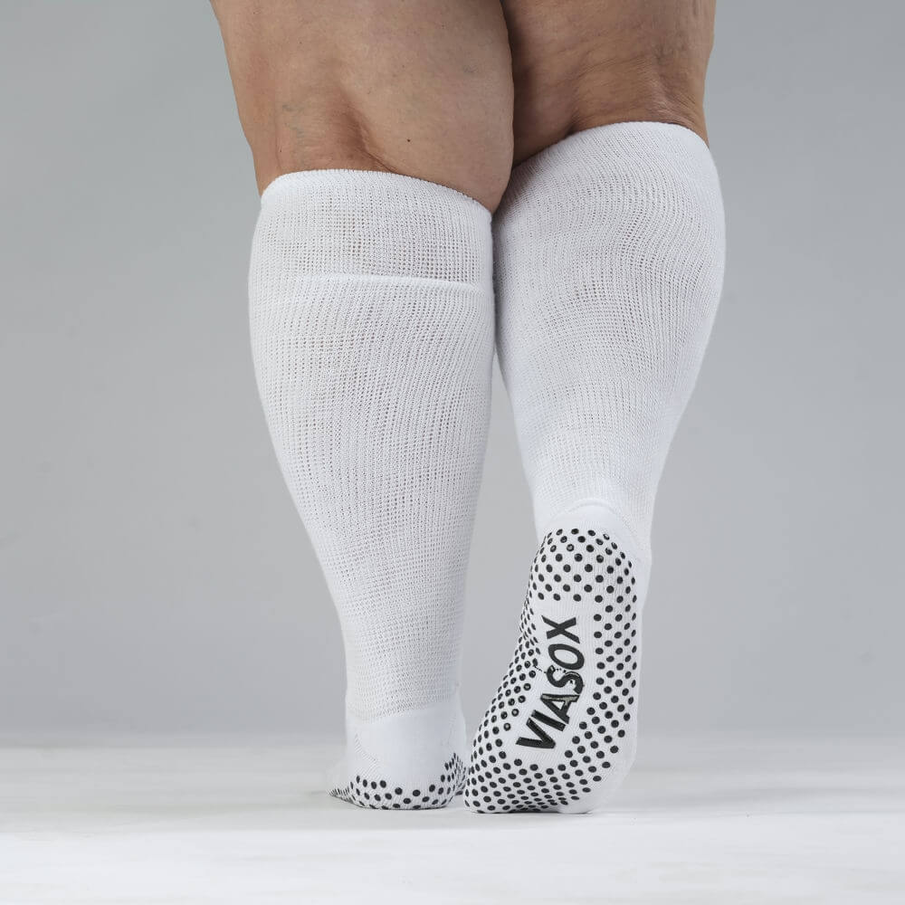 Silicone grip dots on the sole help prevent slips on smooth floors like tile and hardwood. The soft, non-binding fabric stretches up to 30 inches to fit all calf sizes without squeezing. Triple-padded soles cushion each step and help relieve neuropathy pain, while seamless heels and toes prevent rubbing. Moisture-wicking fabric keeps feet dry, and they’re easy to pull on and off — perfect for recovery, hospital stays, or everyday use. With Viasox, you get stability, comfort, and a perfect fit in every step.m